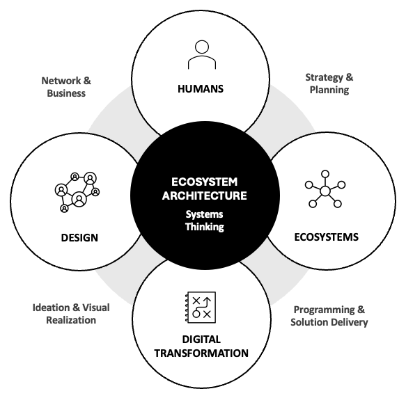 Continuously auditing, architecting, and assessing the ecosystem holistically and it’s individual components (micro-ecosystems) - network, organization, leadership, strategy, operations, business solutions, experiences, digital technology enablers, products, platforms, systems, and more